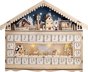 Dekoratívne osvetlenie Solight LED adventný kalendár:LED adventný kalendár v tvare horskej chaty.Kľúčové parametre Solight LED adventného kalendáraPočet LED diód: 10 Farba svetla: Teplá biela Napájanie: 2× AA batérie (nie sú súčasťou) Trieda ochrany: IP20 (vnútorné použitie) Rozmery kalendára: 50 × 40 × 6 cm Materiál: Drevo Farba: Hnedá