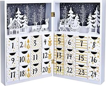 Dekoratívne osvetlenie Solight LED adventný kalendár:LED adventný kalendár so zimnými a vianočnými motívmi.Kľúčové parametre Solight LED adventného kalendáraPočet LED diód: 8 Farba svetla: Teplá biela Napájanie: 2× AAA batérie (nie sú súčasťou) Trieda ochrany: IP20 (vnútorné použitie) Rozmery rozloženého kalendára: 40 × 30 × 4,5 cm Materiál: Drevo Farba: Biela