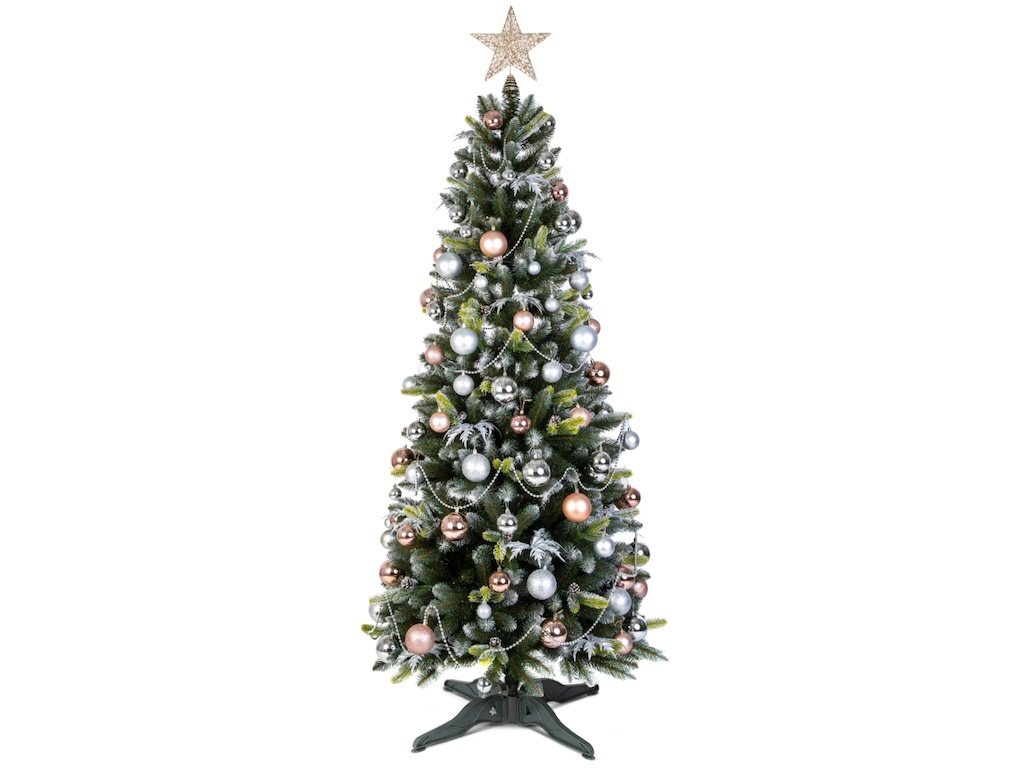 Dakota Rose Gold šetrí čas aj starosti: spolu so stromčekom získate aj vkusne zladené ozdoby v lesklých aj matných povrchoch. Farebná paleta rose gold, striebornej a jemnej perlete pôsobí hrejivo a elegantne, takže sa hodí do moderných aj klasických interiérov. Guľôčky, korálkové reťaze a dekoračné prvky spolu vytvárajú bohatý, harmonický vzhľad bez potreby čokoľvek dokupovať. Vetvy sa ľahko tvarujú a udržia ozdoby na svojom mieste. Po sezóne všetko jednoducho odložíte späť do krabice a budúci rok vyzerá výzdoba rovnako dobre.