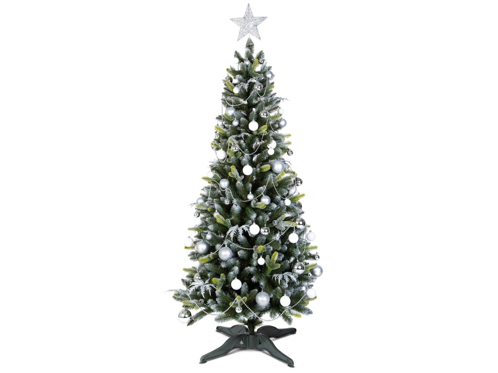 Dakota Ice Silver prináša čistý, zimný vzhľad so striebornými, perleťovými a bielymi akcentmi, ktoré krásne vyniknú na tmavozelenom ihličí. Vopred zladené tvary a veľkosti ozdôb vytvárajú profesionálny efekt bez zdĺhavého plánovania výzdoby. Reťaze a lesklé prvky dodajú stromčeku hĺbku a sviatočný lesk aj pri jemnom osvetlení. Konáre sa dajú rýchlo rozložiť a tvarovať, takže dekorovanie zaberie minimum času. Všetky komponenty sú opakovane použiteľné, aby ste mali bezstarostné Vianoce rok čo rok.